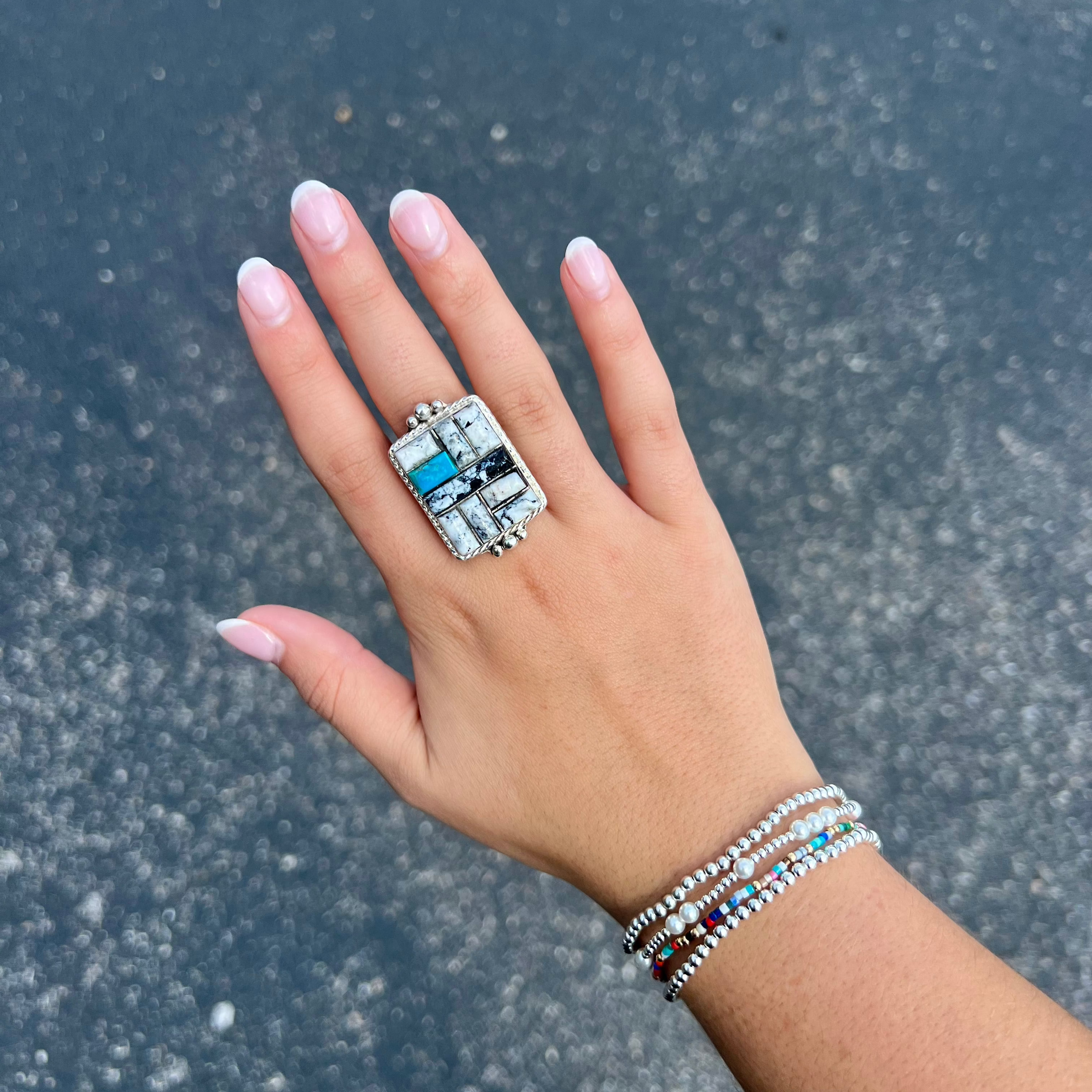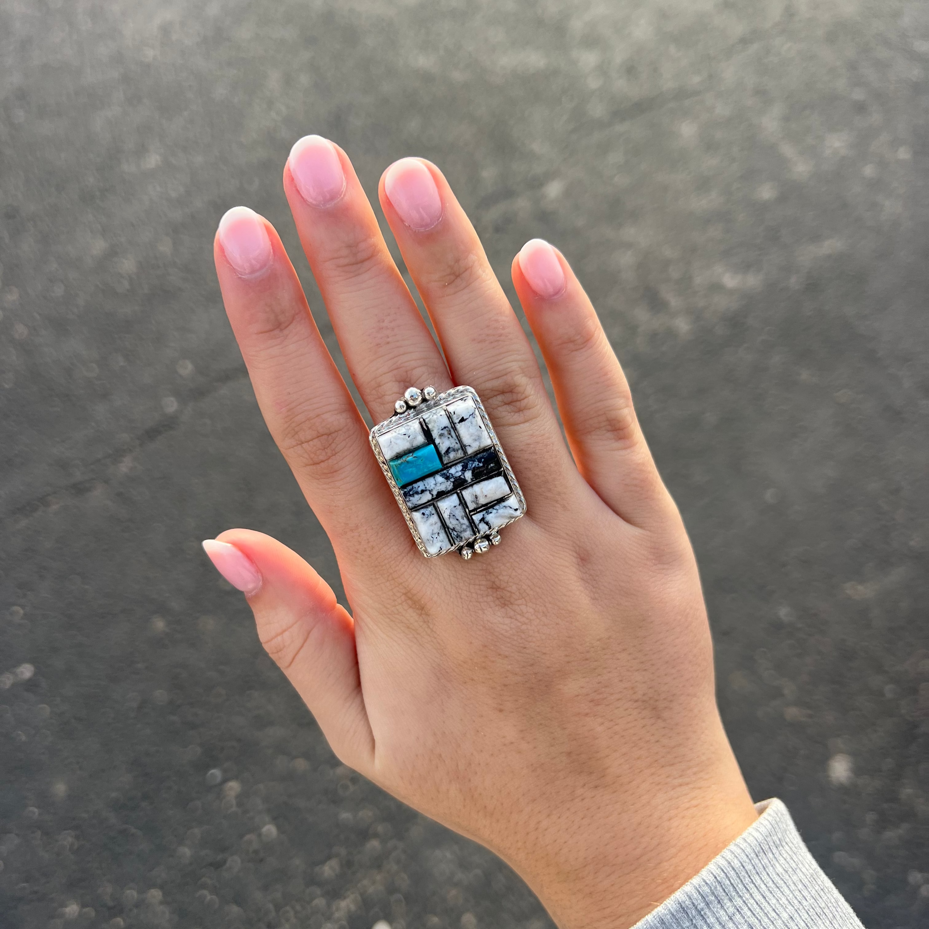 -Sterling Silver Ring with White Buffalo and Turquoise